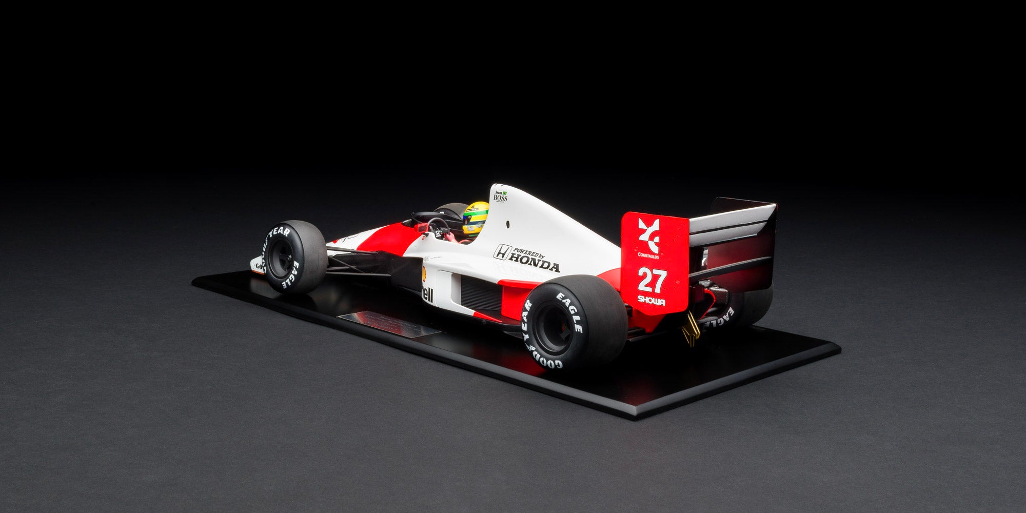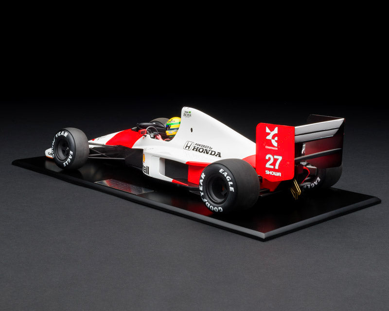 GP Replicas 1:12 McLaren MP4/6, 1991 Brazilian Grand Prix winner driven by Ayrton Senna. Includes display case and figurine. Limited production.