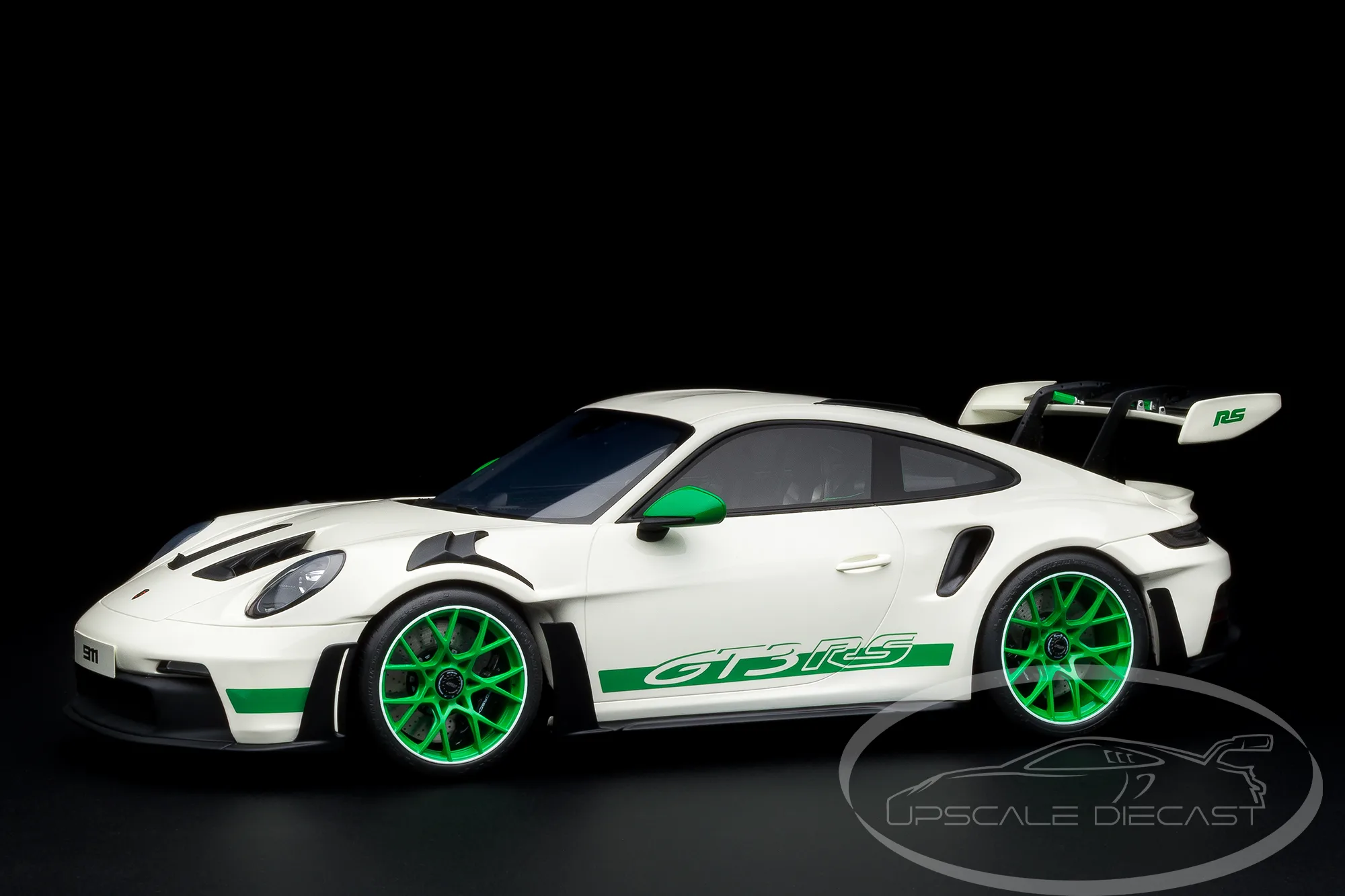 The Porsche 911 (992) GT3 RS arrives in its striking 2022 Carrera RS Tribute White / Green livery, faithfully recreated in commanding 1:12 scale by GT-Spirit. Designed as a homage to Porsche’s legendary Carrera RS heritage, this model blends modern motorsport engineering with iconic historical styling. As a result, it stands as a bold centerpiece for serious Porsche collectors.