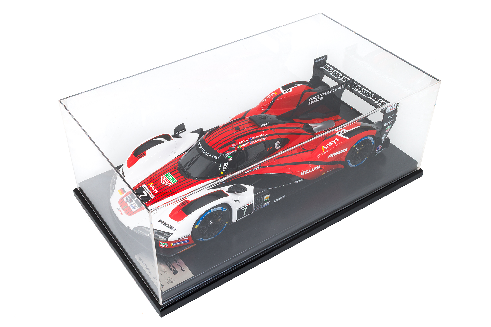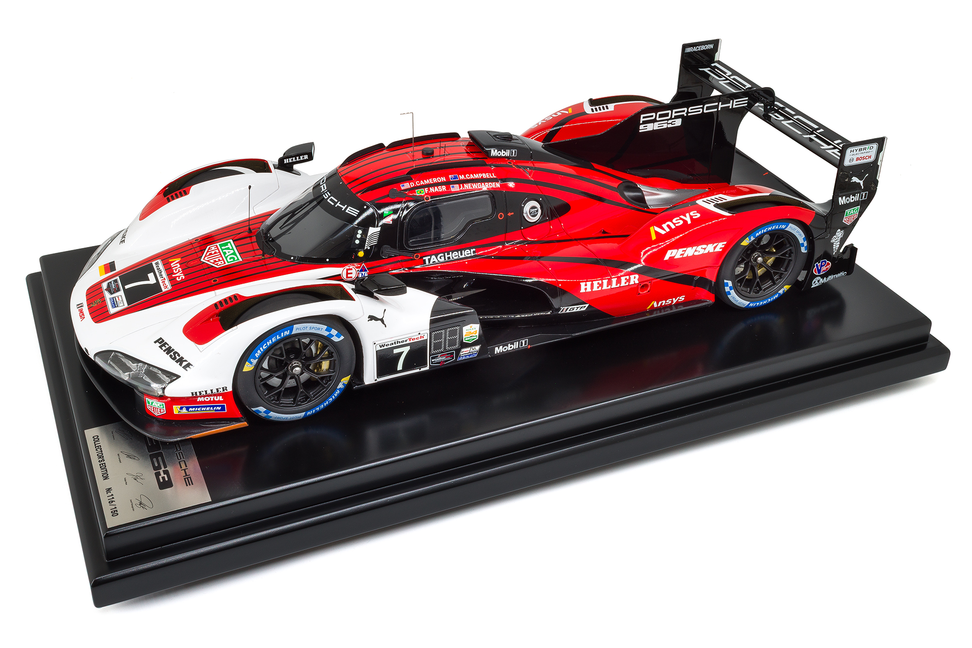 This edition comes in a special run of only 150 units worldwide. Each model includes an exclusive display base and cover that protect your piece from dust and maintain its show-quality appearance. The Porsche 963 Penske livery commemorates the drivers D. Cameron, M. Campbell, F. Nasr & J. Newgarden who brought home the Daytona 24-Hour win.