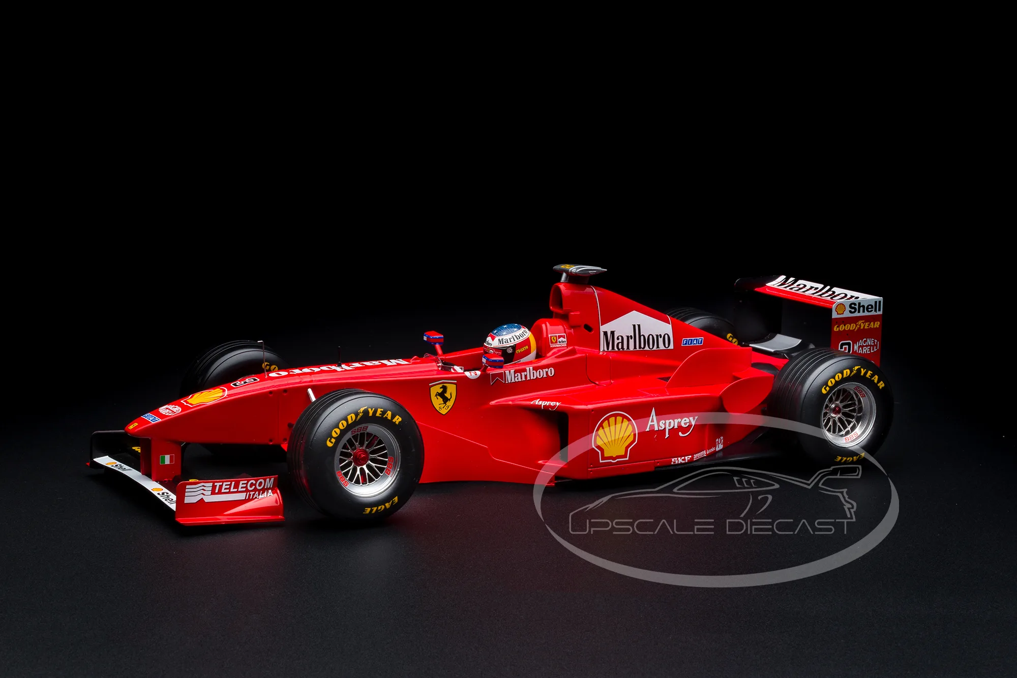 The cockpit reflects the focused, purposeful design of late-1990s Formula 1 machinery. Steering wheel, seat, instrumentation, and surrounding controls are carefully rendered for scale realism. Additionally, visible mechanical and aerodynamic elements highlight the engineering sophistication of the Ferrari F300 beneath its sleek bodywork. As a result, the model conveys the intensity and precision that defined Schumacher’s era at Ferrari.